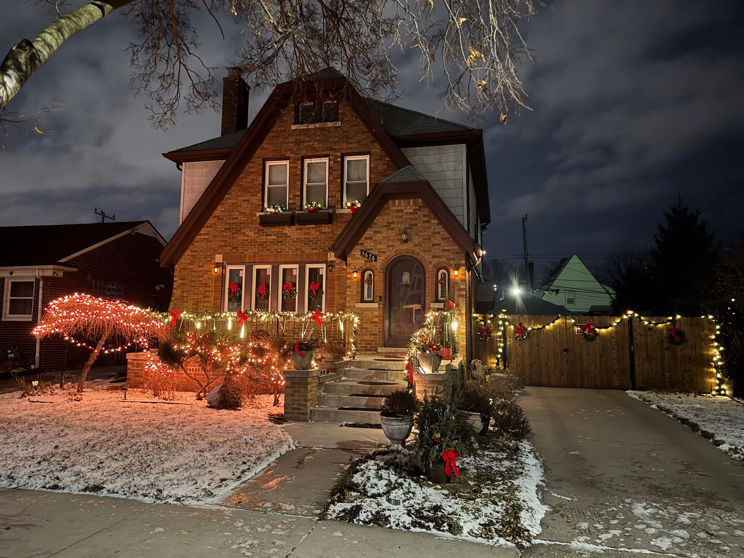 Coming in third place is Toni Tryan, a 25-year resident of Morningside living off Berkshire between Windsor and Brunswick. This season, Toni’s brick Tudor served as a showcase of holiday elegance, beautifully adorned with warm white lights, red ribbons, and lush green garland and wreaths. While the photo here captures its charm, the display’s true magic is revealed on video, where shimmering icicle lights draped the porch railing to create an enchanting winter scene. After two and a half decades in the neighborhood, Toni continues to bring a sophisticated touch of class to our community!